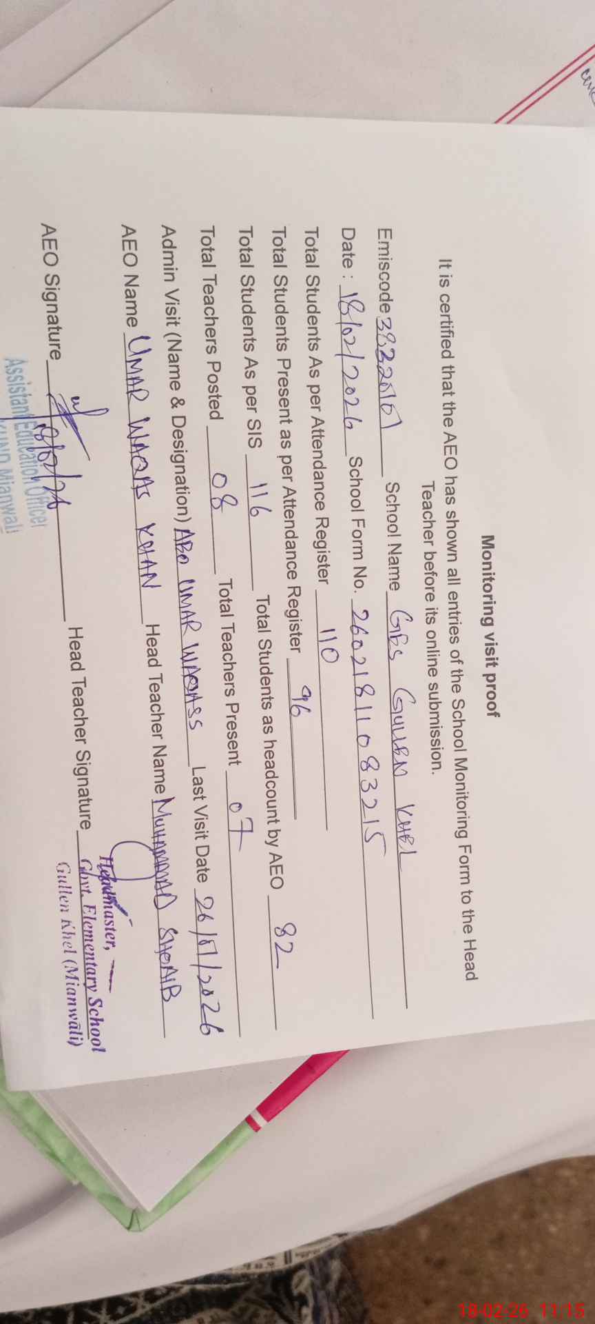 | Attendance Register | Head Teacher | MEA with School | Visit Proof |