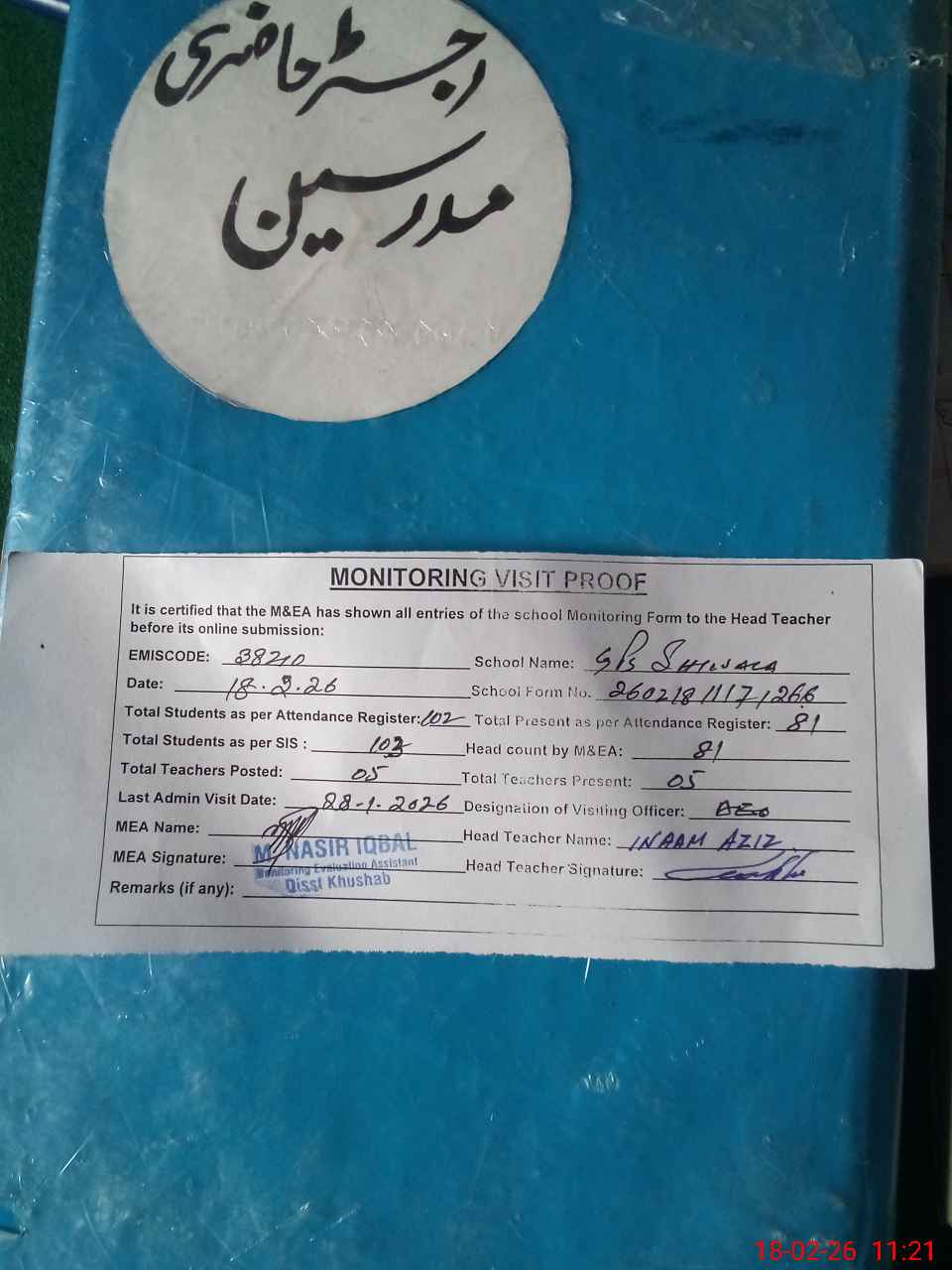 | Attendance Register | Head Teacher | MEA with School | Visit Proof |