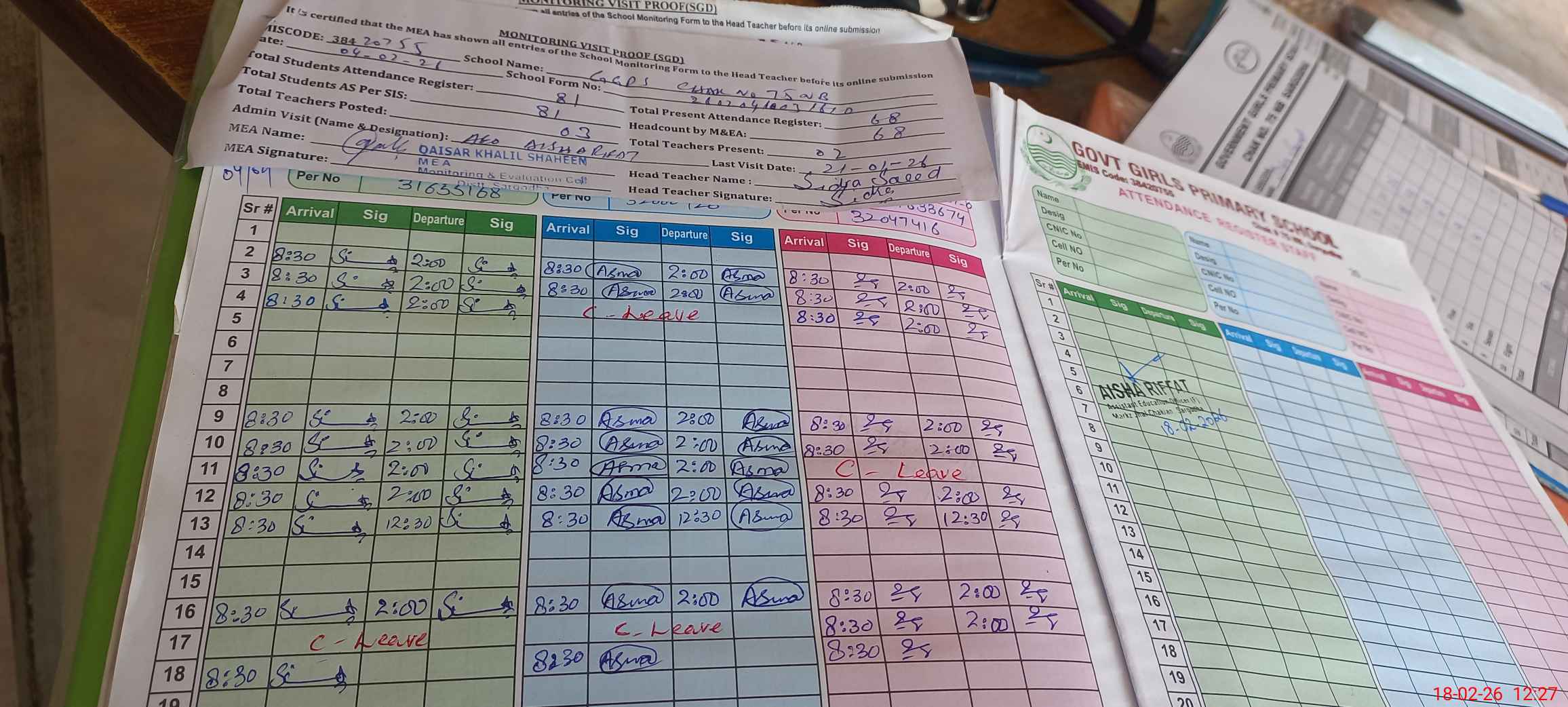 | Attendance Register | Head Teacher | MEA with School | Visit Proof |