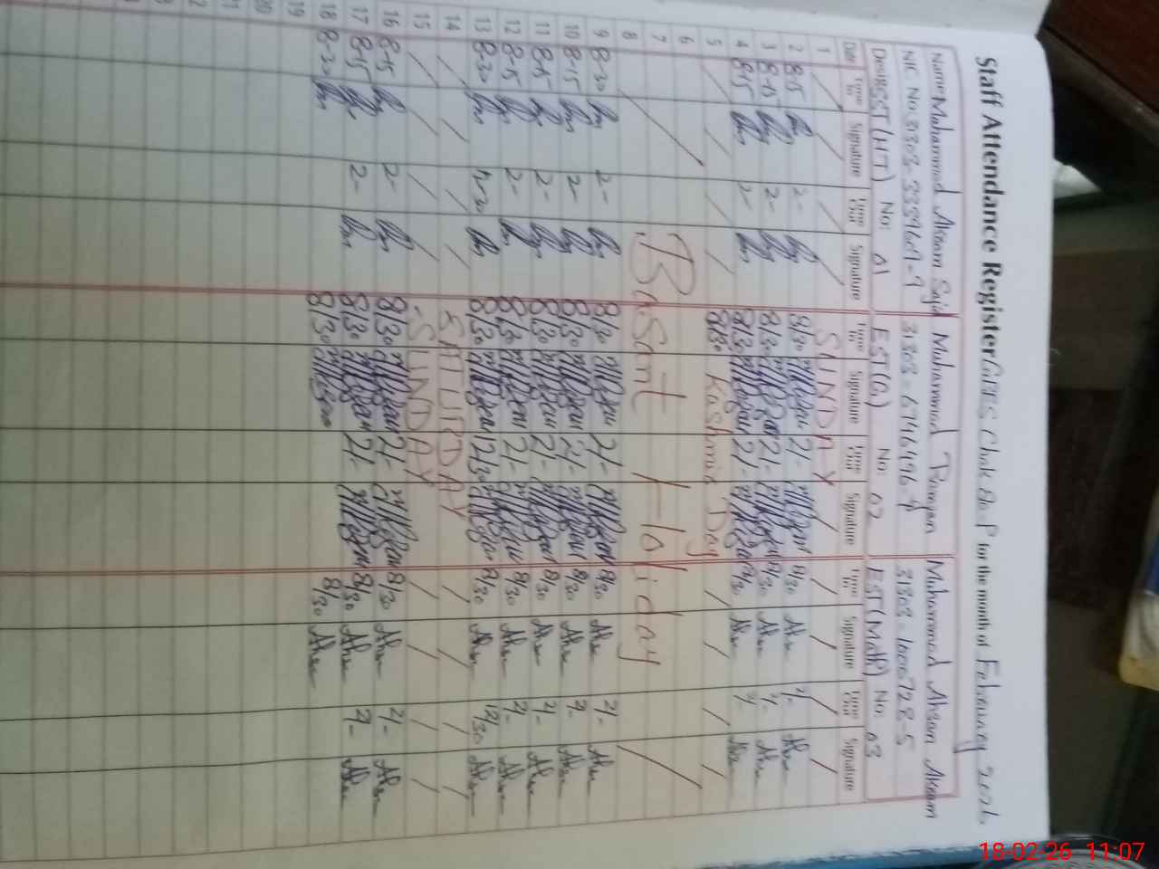 | CNIC | Full Name | Designation | R/C | Absence During Last Calender Month |