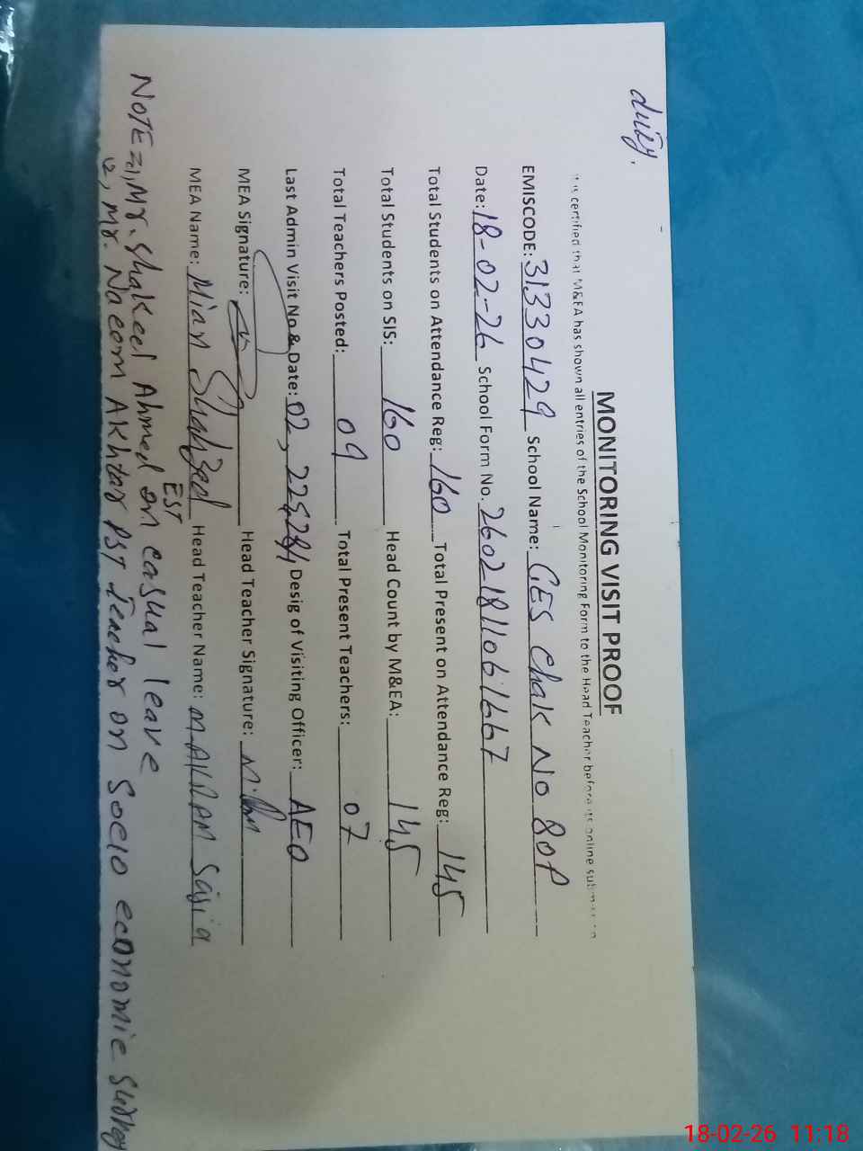 | Attendance Register | Head Teacher | MEA with School | Visit Proof |