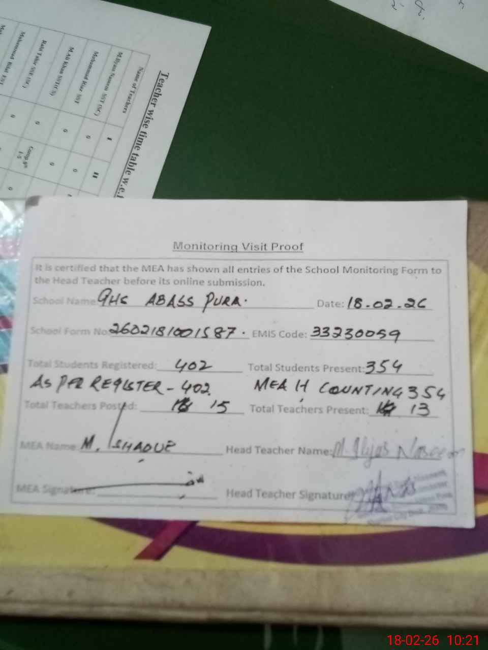 | Attendance Register | Head Teacher | MEA with School | Visit Proof |