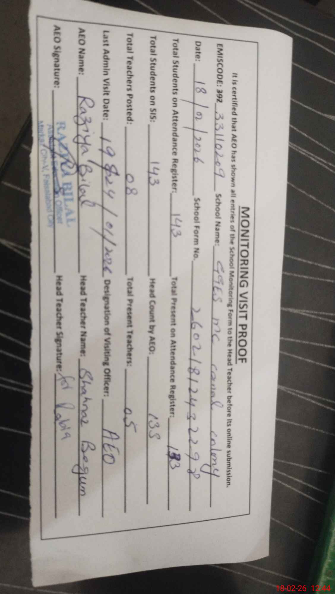 | Attendance Register | Head Teacher | MEA with School | Visit Proof |