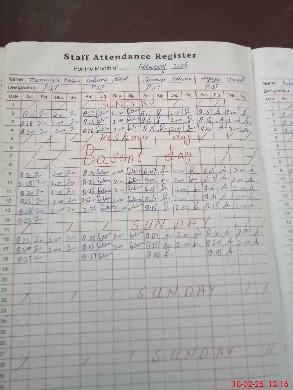 | Name: Zu**** Ka**** Designation: (School Headmaster's/Headmistress's) Head Mistress Phone/Cell Number: 03**** |