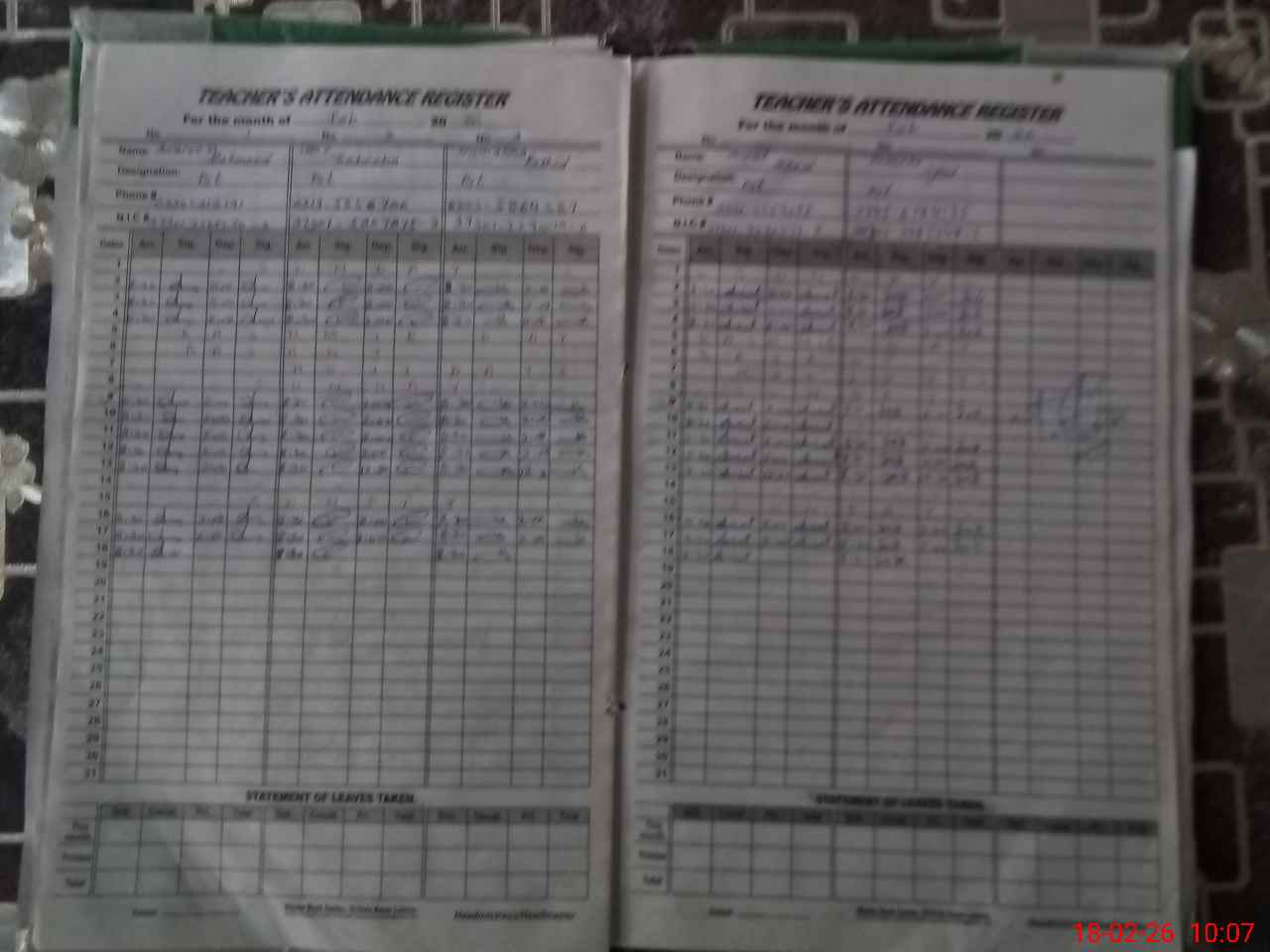 | CNIC | Full Name | Designation | R/C | Absence During Last Calender Month |