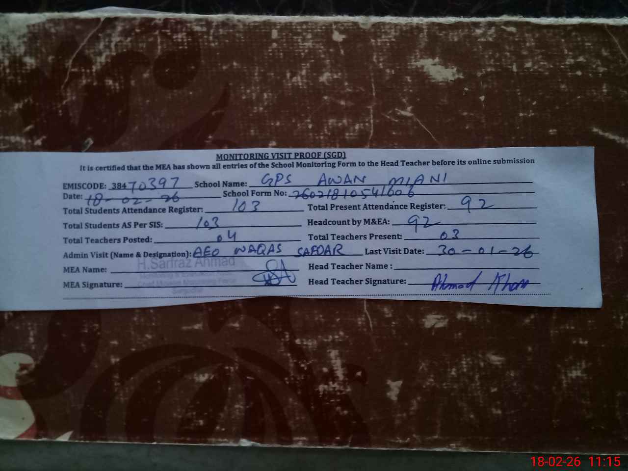 | Attendance Register | Head Teacher | MEA with School | Visit Proof |