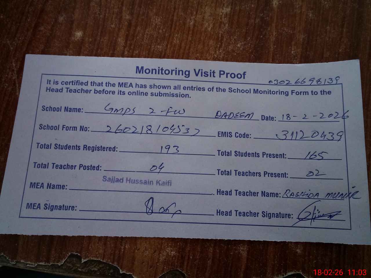 | Attendance Register | Head Teacher | MEA with School | Visit Proof |