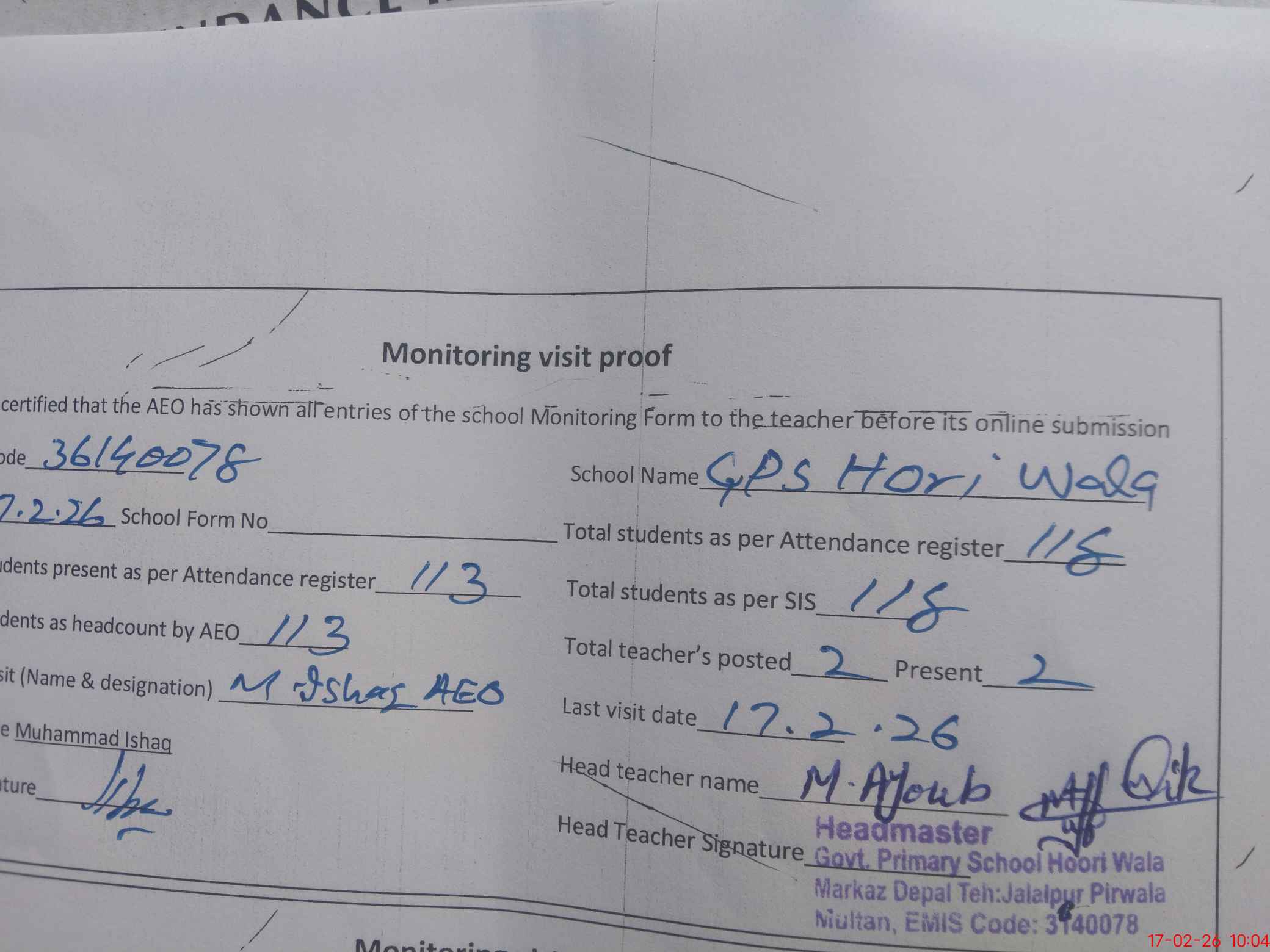 | EMIS Code: 36140078 | Name of School: GPS HOORI WALA | |||