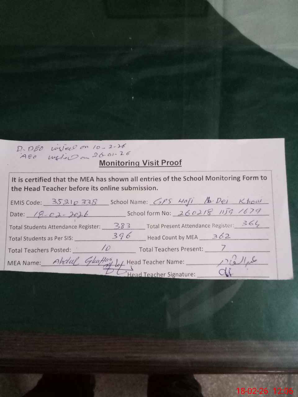 | Attendance Register | Head Teacher | MEA with School | Visit Proof |