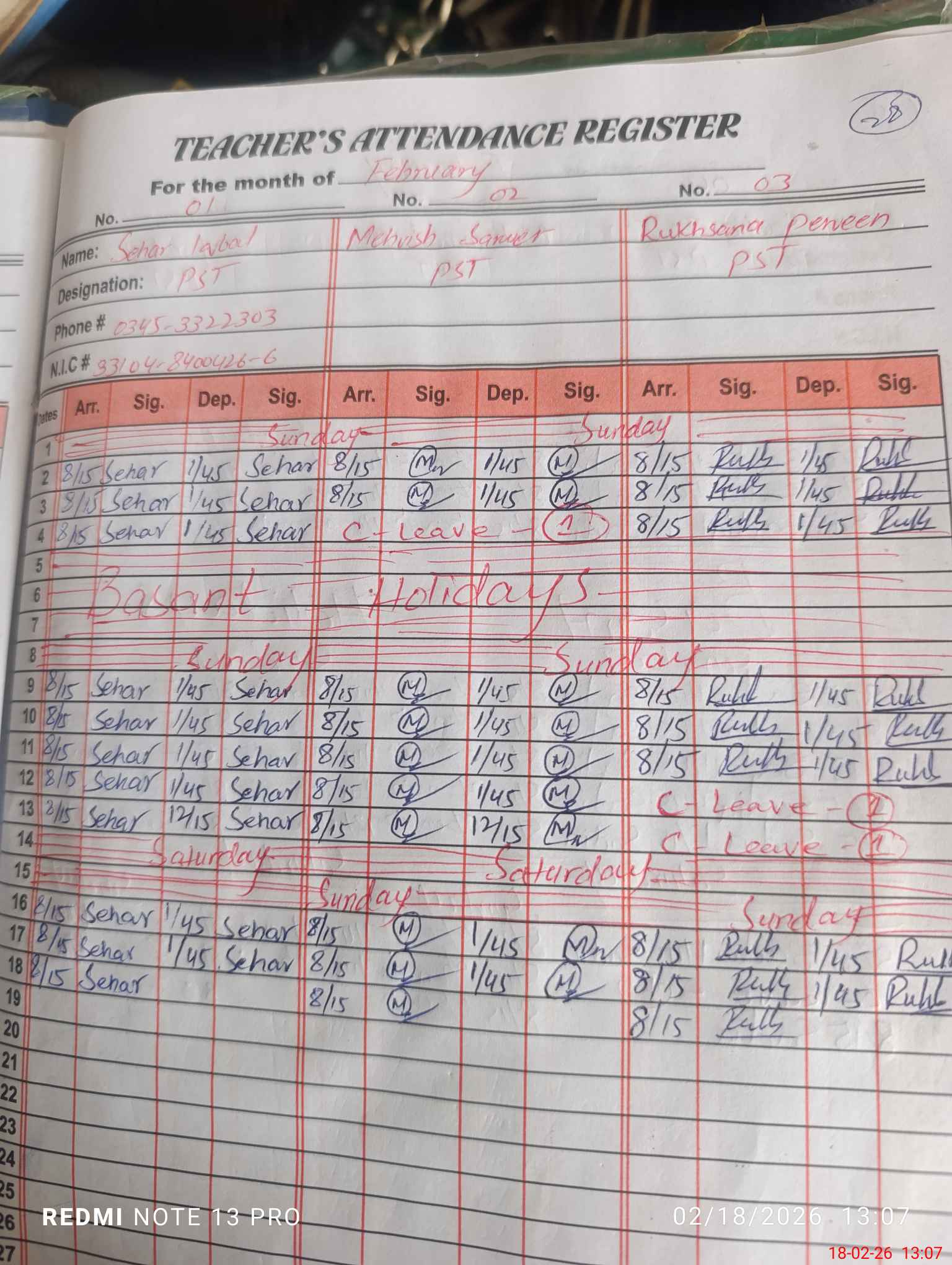 | CNIC | Full Name | Designation | R/C | Absence During Last Calender Month |