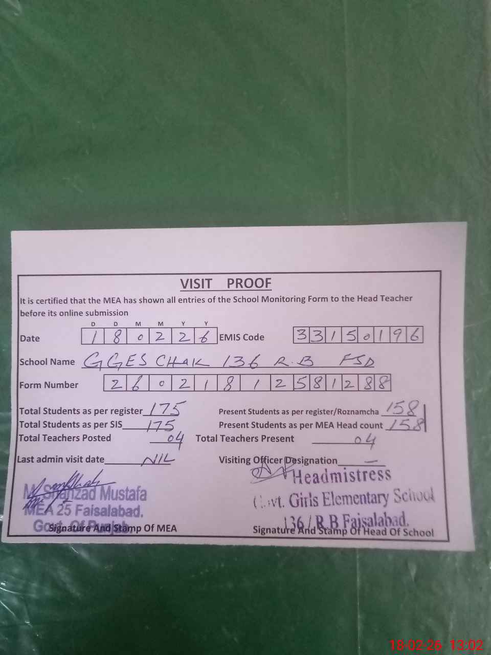 | Attendance Register | Head Teacher | MEA with School | Visit Proof |
