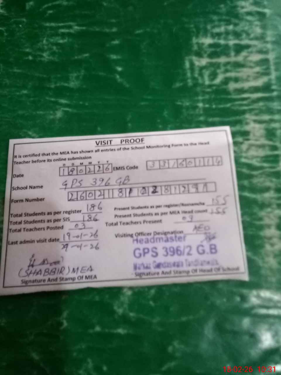 | Attendance Register | Head Teacher | MEA with School | Visit Proof |
