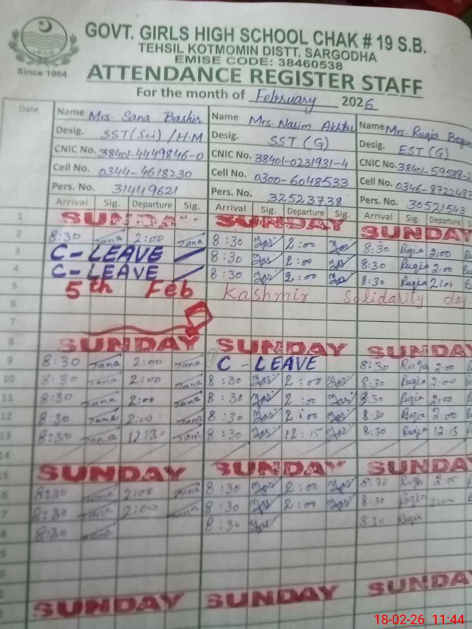 | Name: SA**** BA**** Designation: (School Headmaster's/Headmistress's) SST SCIENCE (HEADMISTRESS) Phone/Cell Number: 03**** |