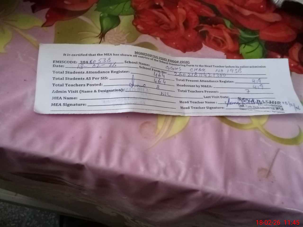 | Attendance Register | Head Teacher | MEA with School | Visit Proof |
