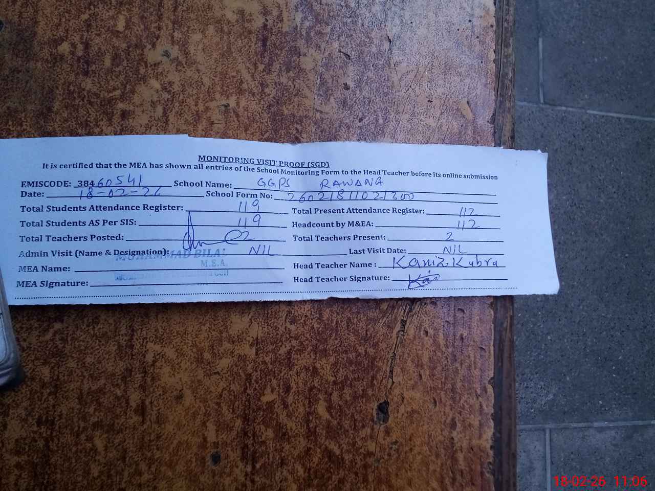 | Attendance Register | Head Teacher | MEA with School | Visit Proof |