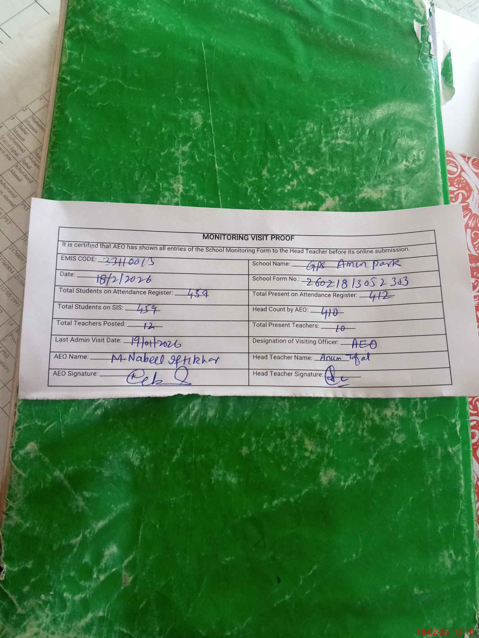 | Attendance Register | Head Teacher | MEA with School | Visit Proof |