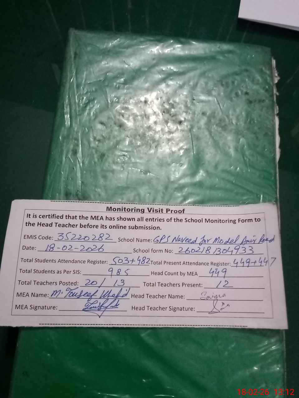 | Attendance Register | Head Teacher | MEA with School | Visit Proof |