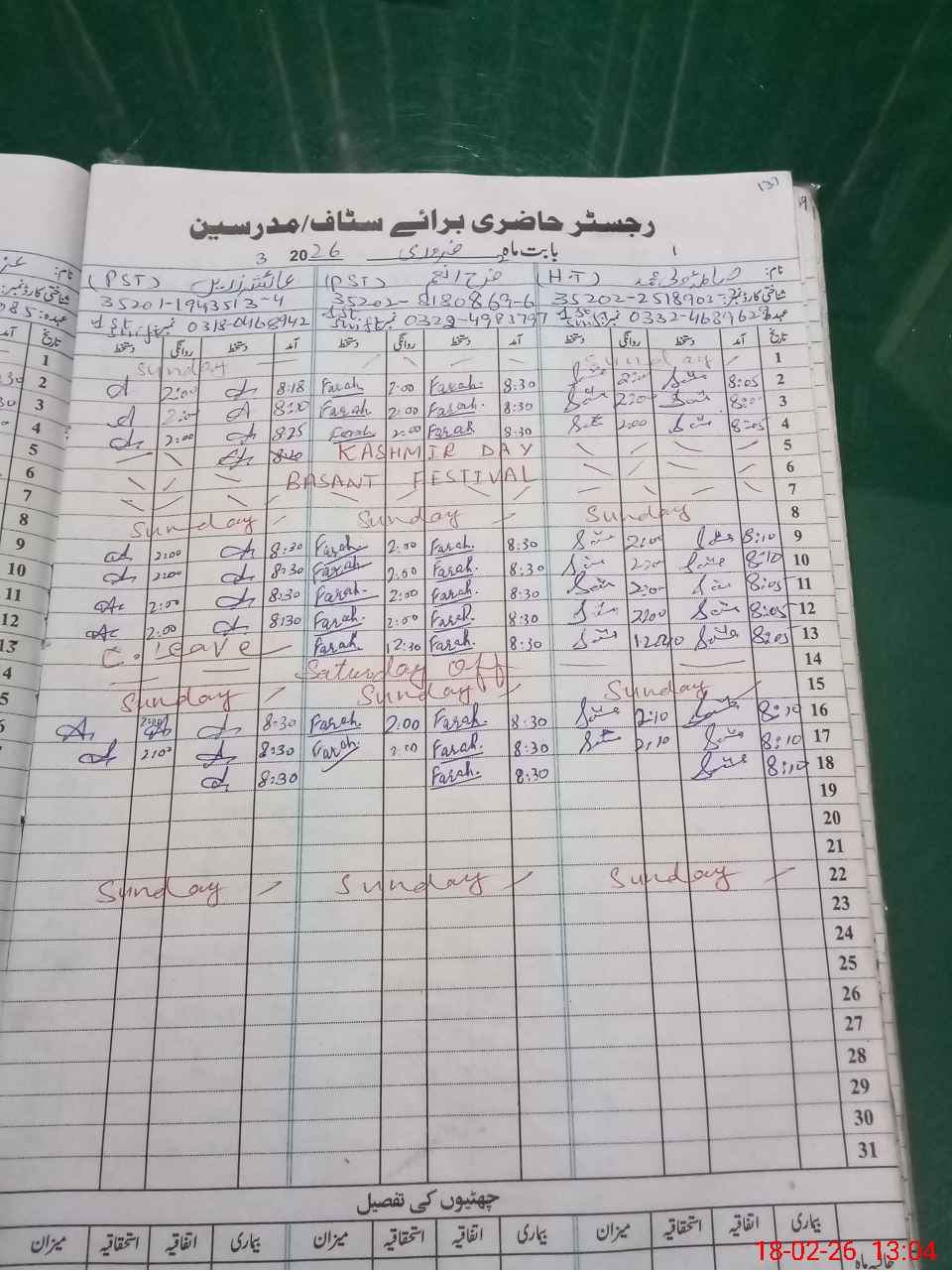 | CNIC | Full Name | Designation | R/C | Absence During Last Calender Month |