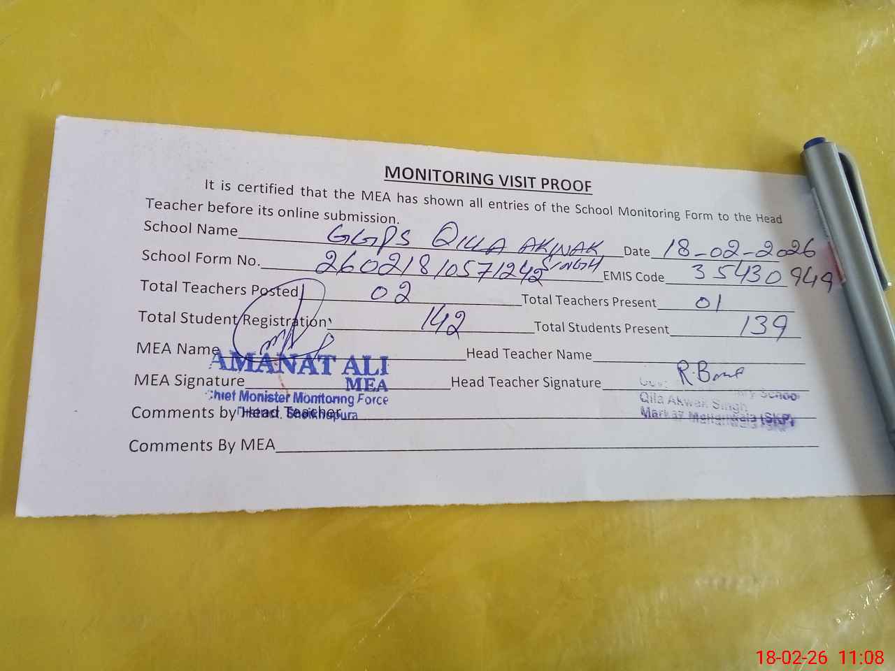 | Attendance Register | Head Teacher | MEA with School | Visit Proof |