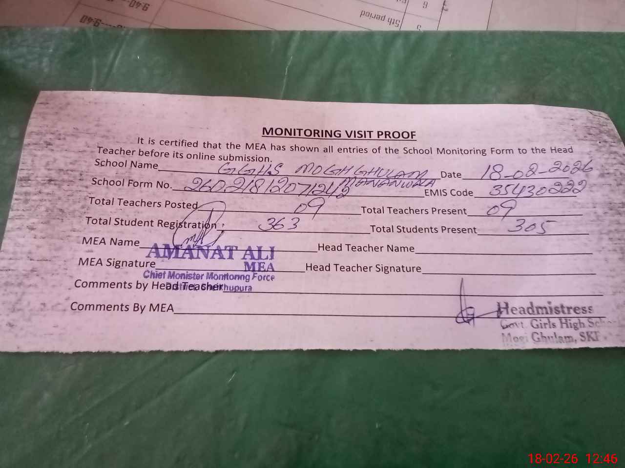 | EMIS Code: 35430222 | Name of School: GGHS MOGI GHULAM P/O MANAN WALA | |||