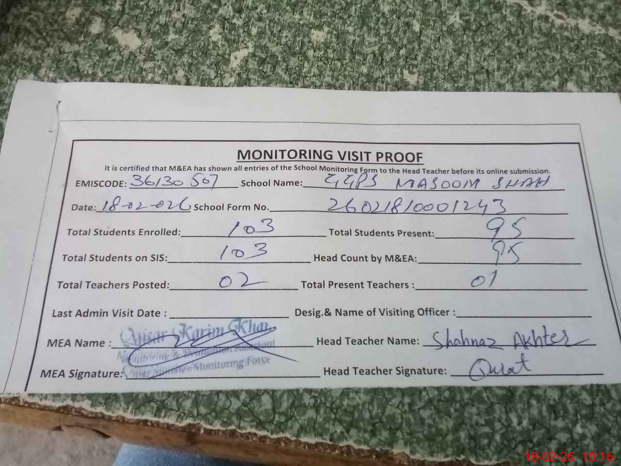 | Attendance Register | Head Teacher | MEA with School | Visit Proof |