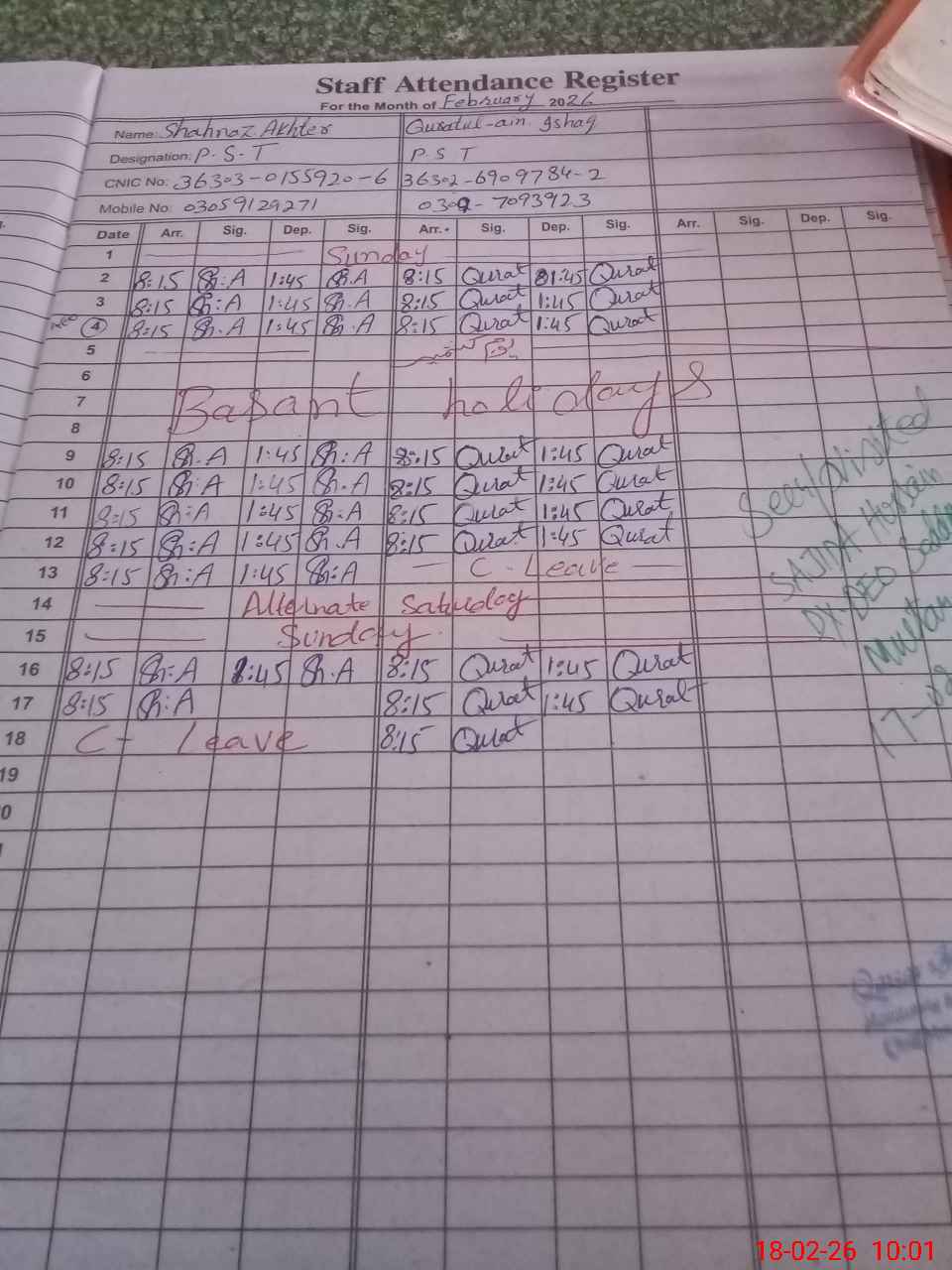 | CNIC | Full Name | Designation | R/C | Absence During Last Calender Month |