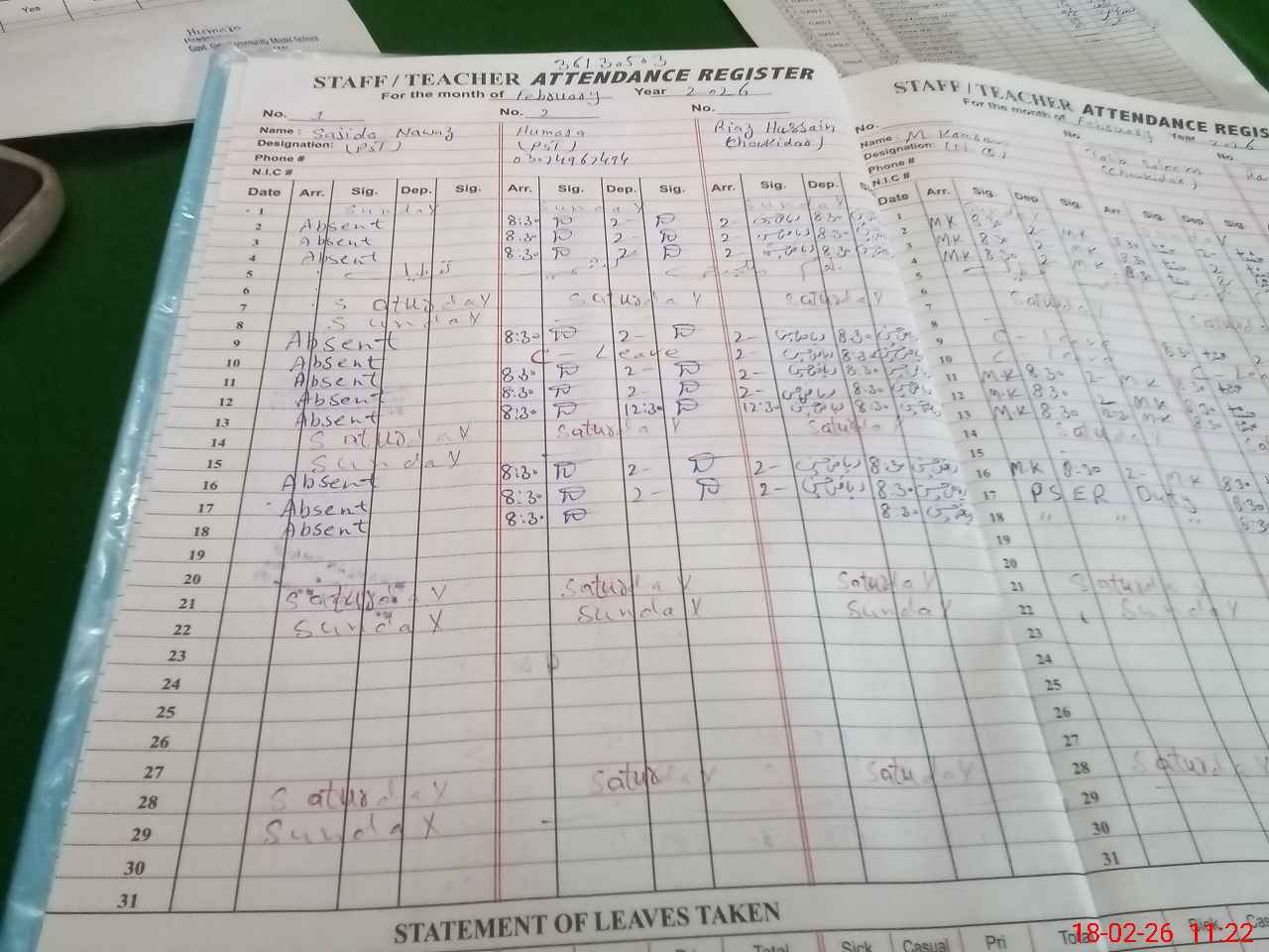 | 36**** | Sa**** Na**** | PST Science/Maths | Regular | 0 | 0 | 0 | 0 | 0 | 0 | 0 | 0 | 0 | Absent (Un-Authorized) |