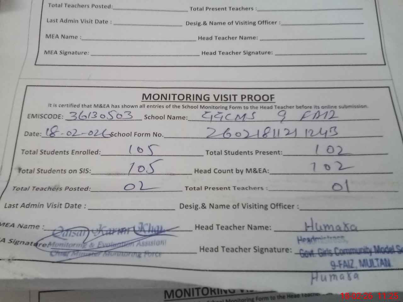 | Certified that this School was Inspected by the Undersigned MEA/DMO Today and the Information Stated Above is as Per Record. | |||||