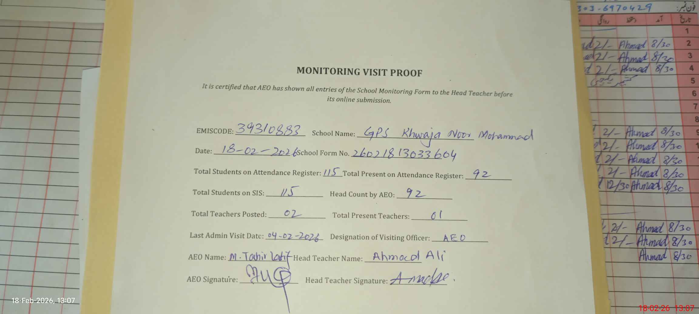 | Monitoring Date: 18-02-2026 | Start Time: 18-02-2026 12:34 PM | End Time: 18-02-2026 01:17 PM | Name of MEA: Mu**** Ta**** La**** | |