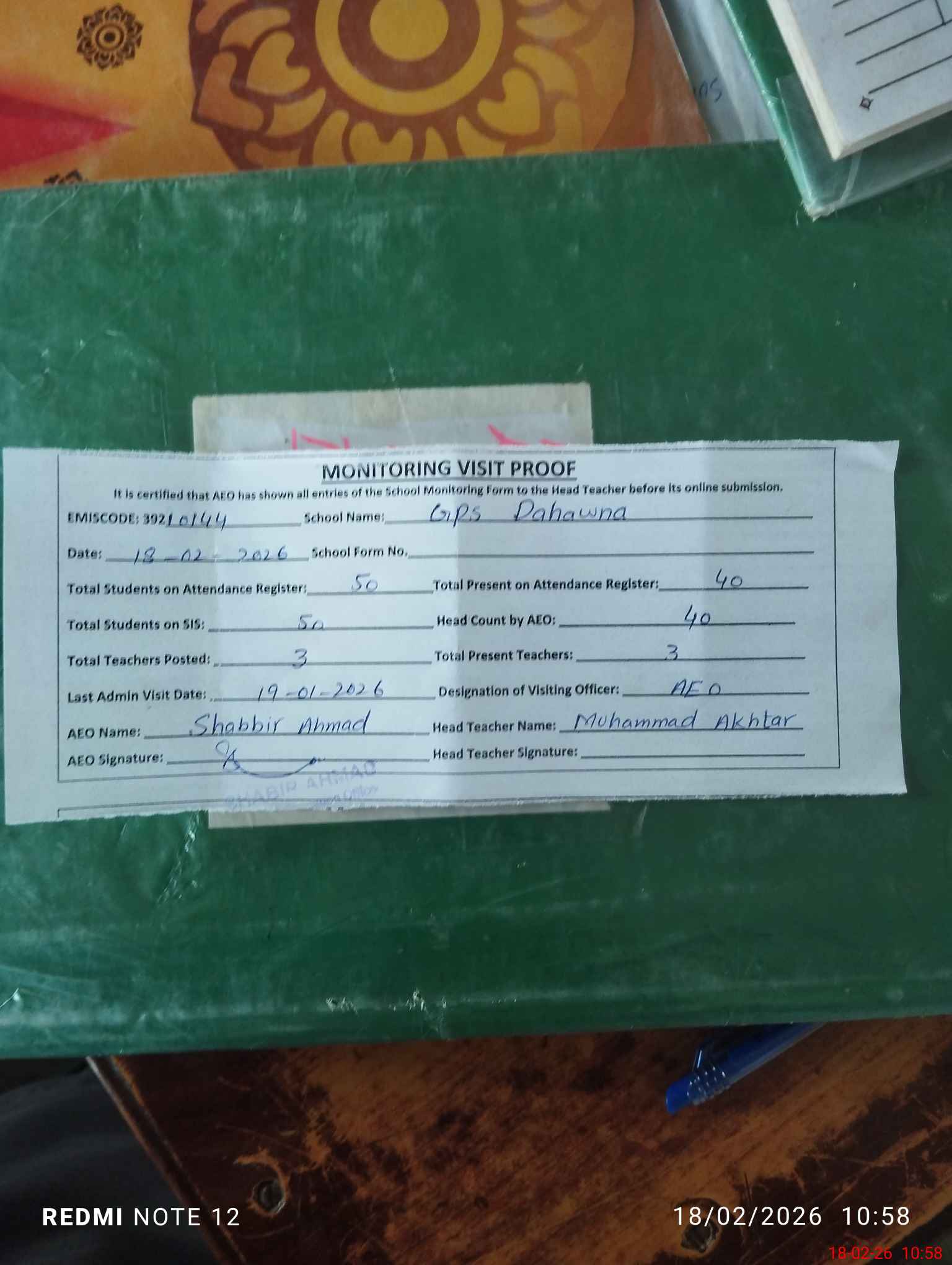 | Certified that this School was Inspected by the Undersigned MEA/DMO Today and the Information Stated Above is as Per Record. | |||||