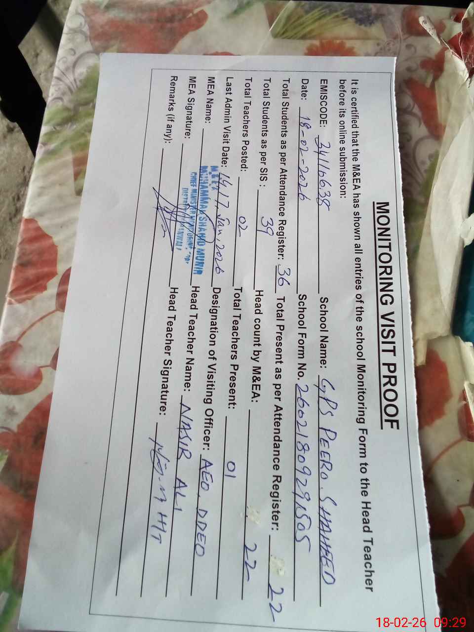 | Attendance Register | Head Teacher | MEA with School | Visit Proof |