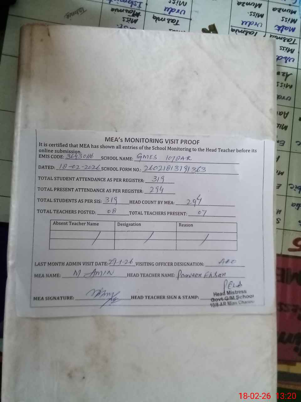 | Attendance Register | Head Teacher | MEA with School | Visit Proof |