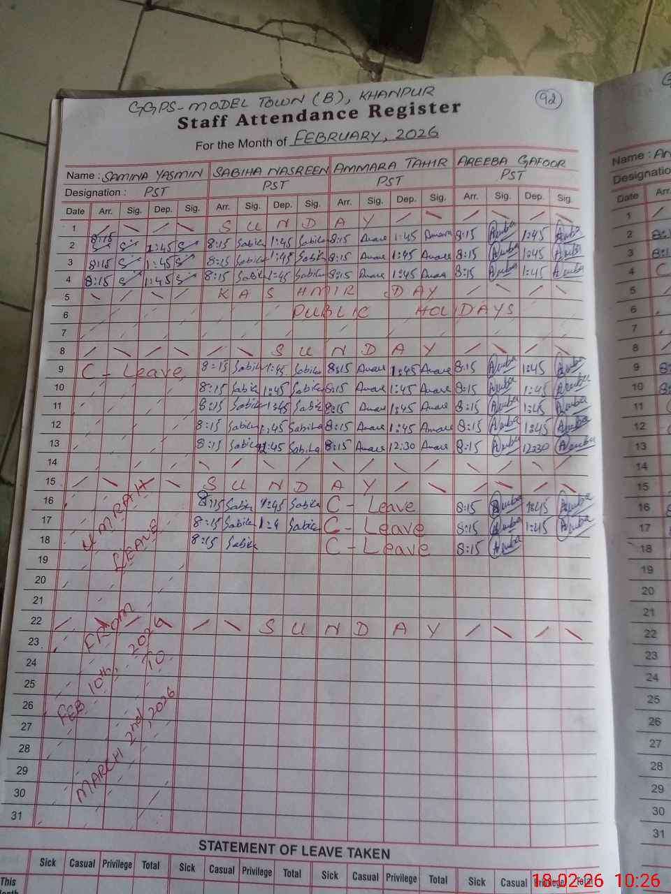 | Leave | Duty | Absent | Maternity | Medical | Ex- Pak |