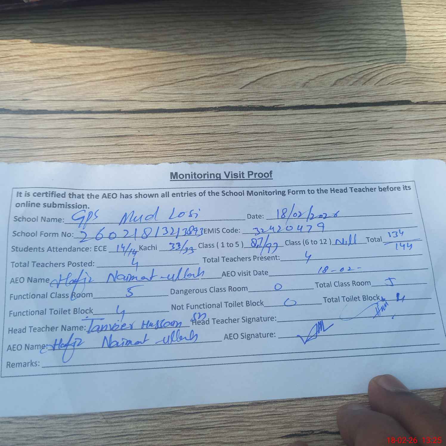 | Attendance Register | Head Teacher | MEA with School | Visit Proof |