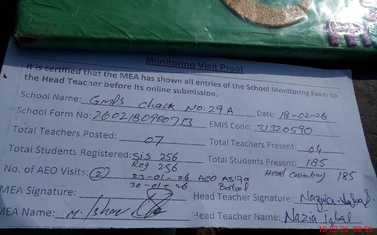 | EMIS Code: 31320590 | Name of School: GMPS CHAK NO.29 QADEEM | |||