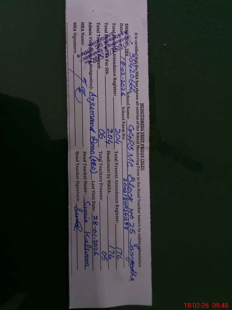 | Attendance Register | Head Teacher | MEA with School | Visit Proof |