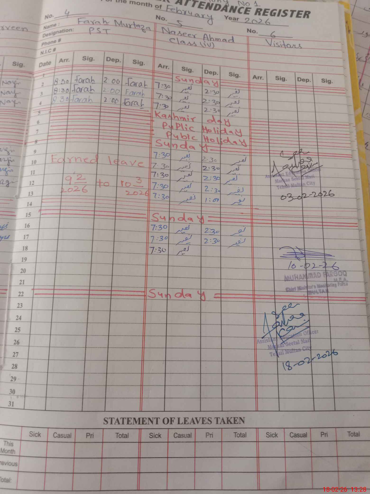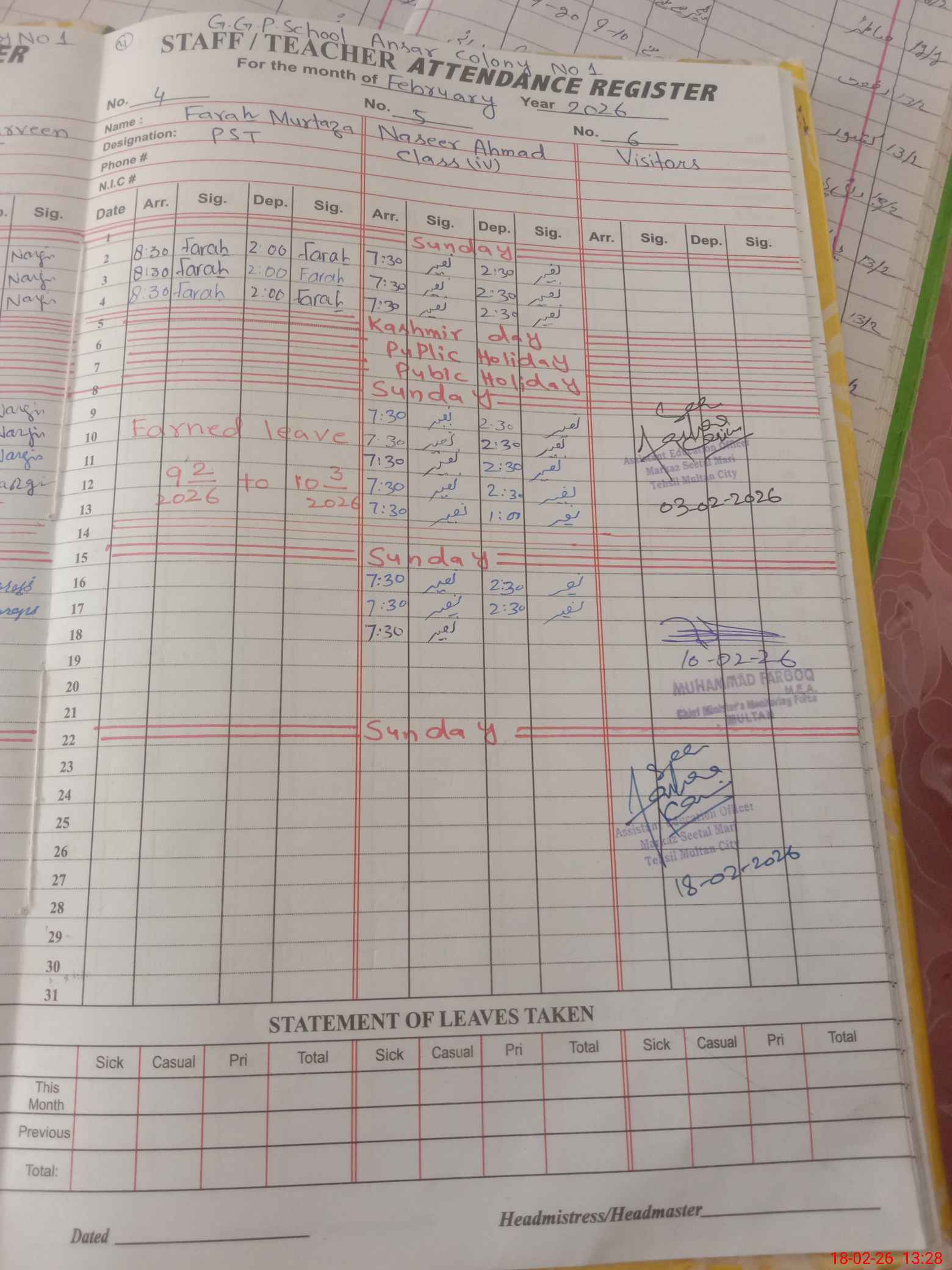 | Name: SA**** SH**** Designation: (School Headmaster's/Headmistress's) PST Phone/Cell Number: 03**** |