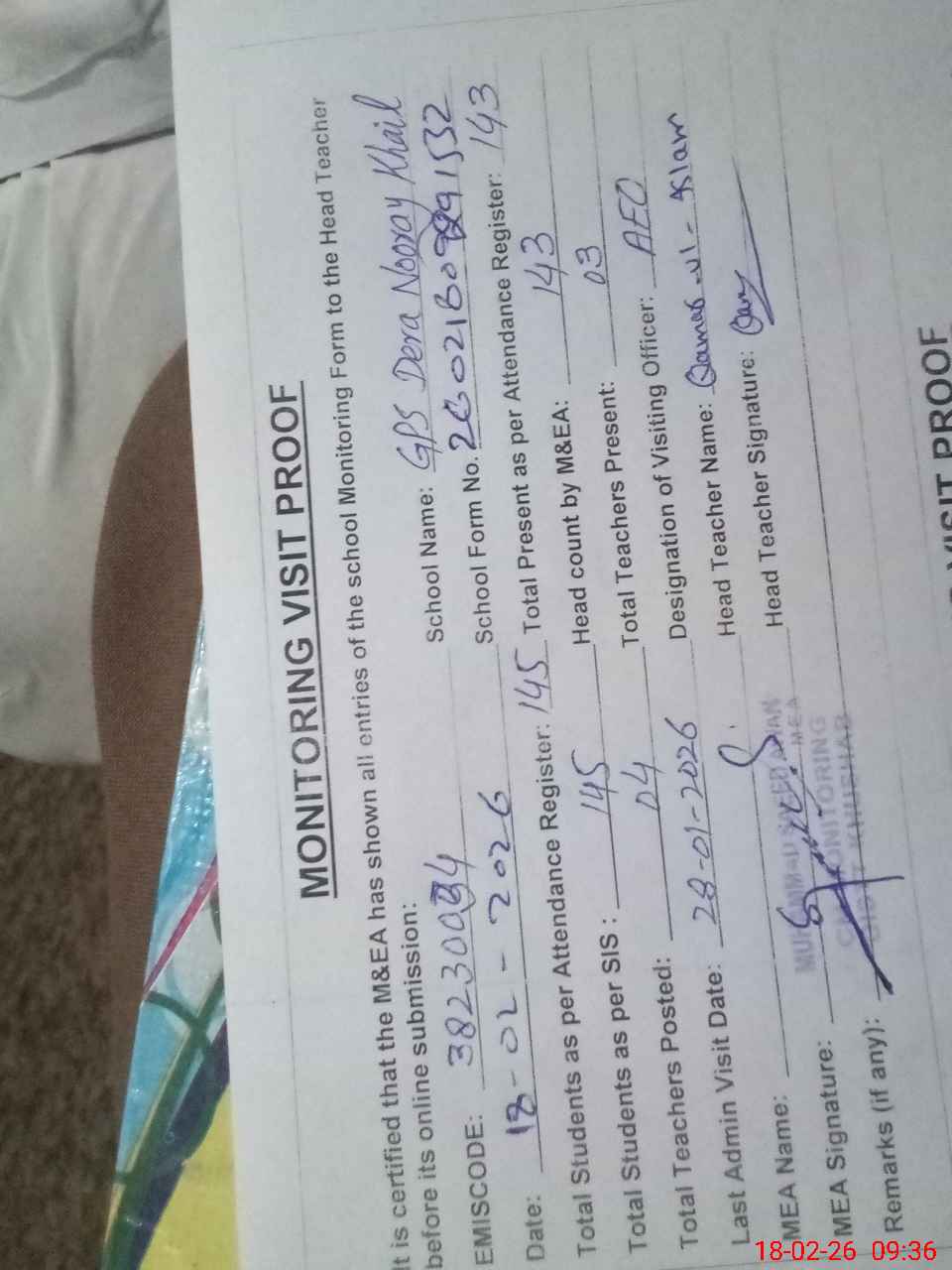 | Remarks (Use Separate Page if Required): Students on SIS QTY 145 Last admin visit On 28 January 2026 by AEO | |||||