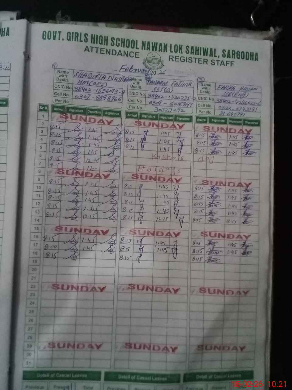 | CNIC | Full Name | Designation | R/C | Absence During Last Calender Month |