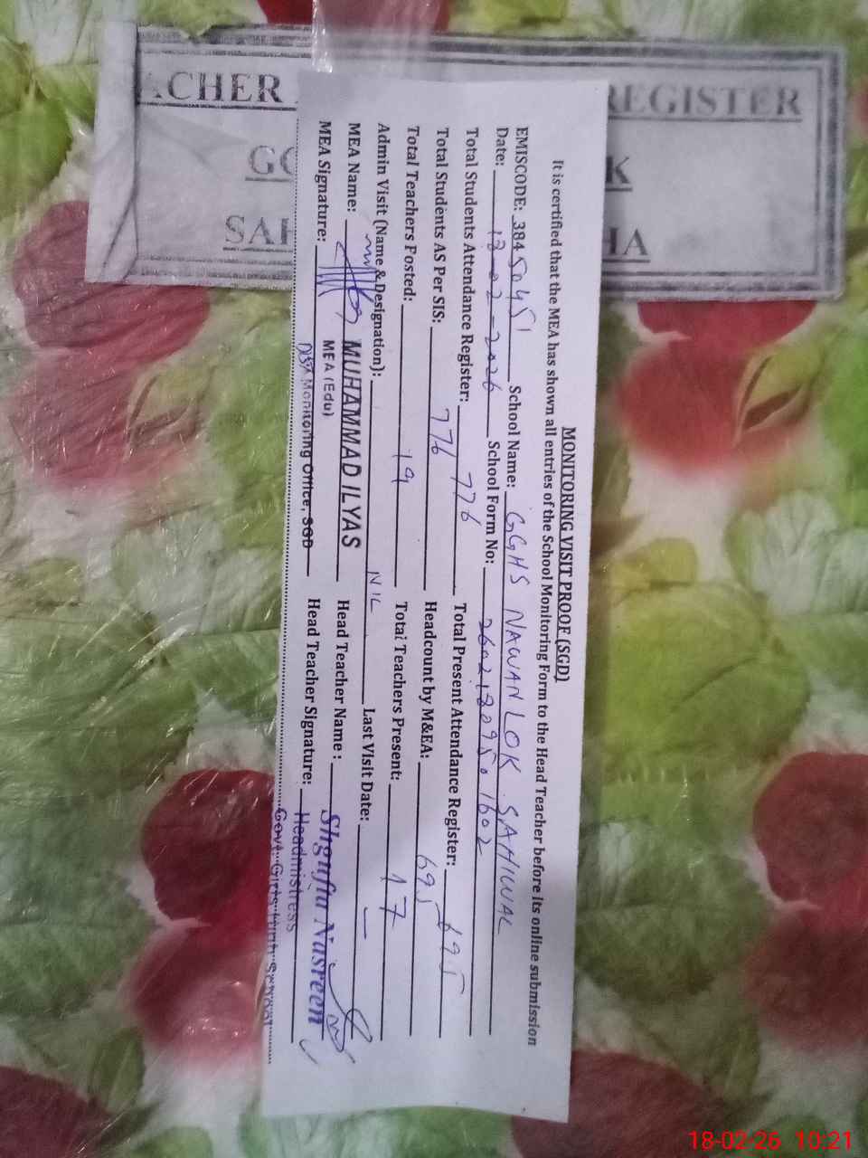 | Attendance Register | Head Teacher | MEA with School | Visit Proof |