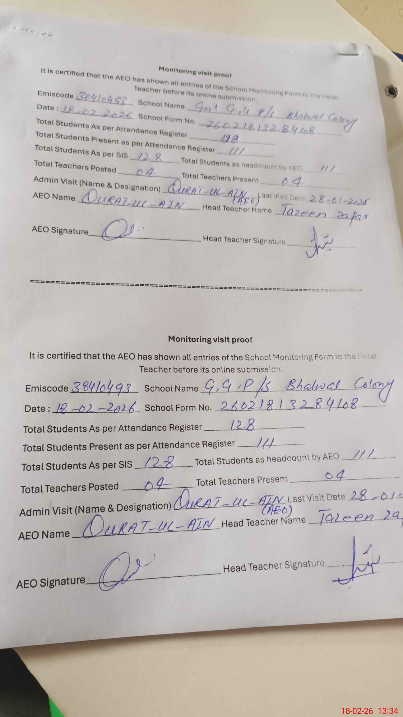 | Monitoring Date: 18-02-2026 | Start Time: 18-02-2026 01:16 PM | End Time: 18-02-2026 01:34 PM | Name of MEA: QU**** ULAI**** | |