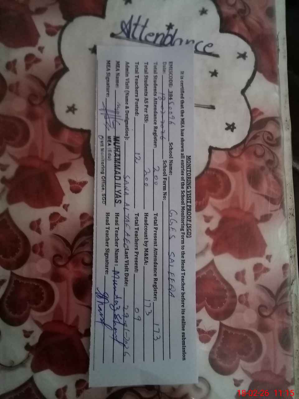 | Attendance Register | Head Teacher | MEA with School | Visit Proof |