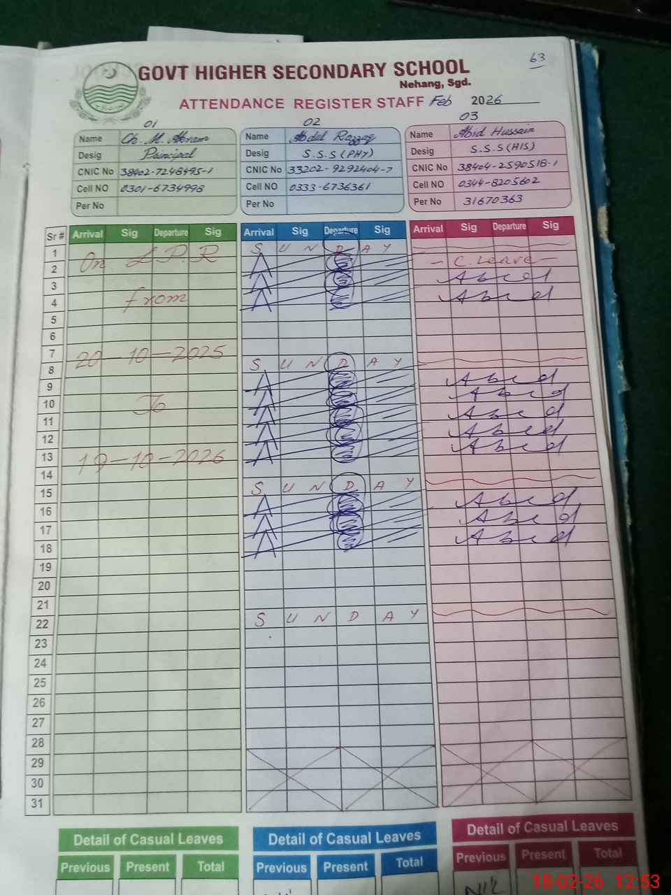 | CNIC | Full Name | Designation | R/C | Absence during last cal. month |