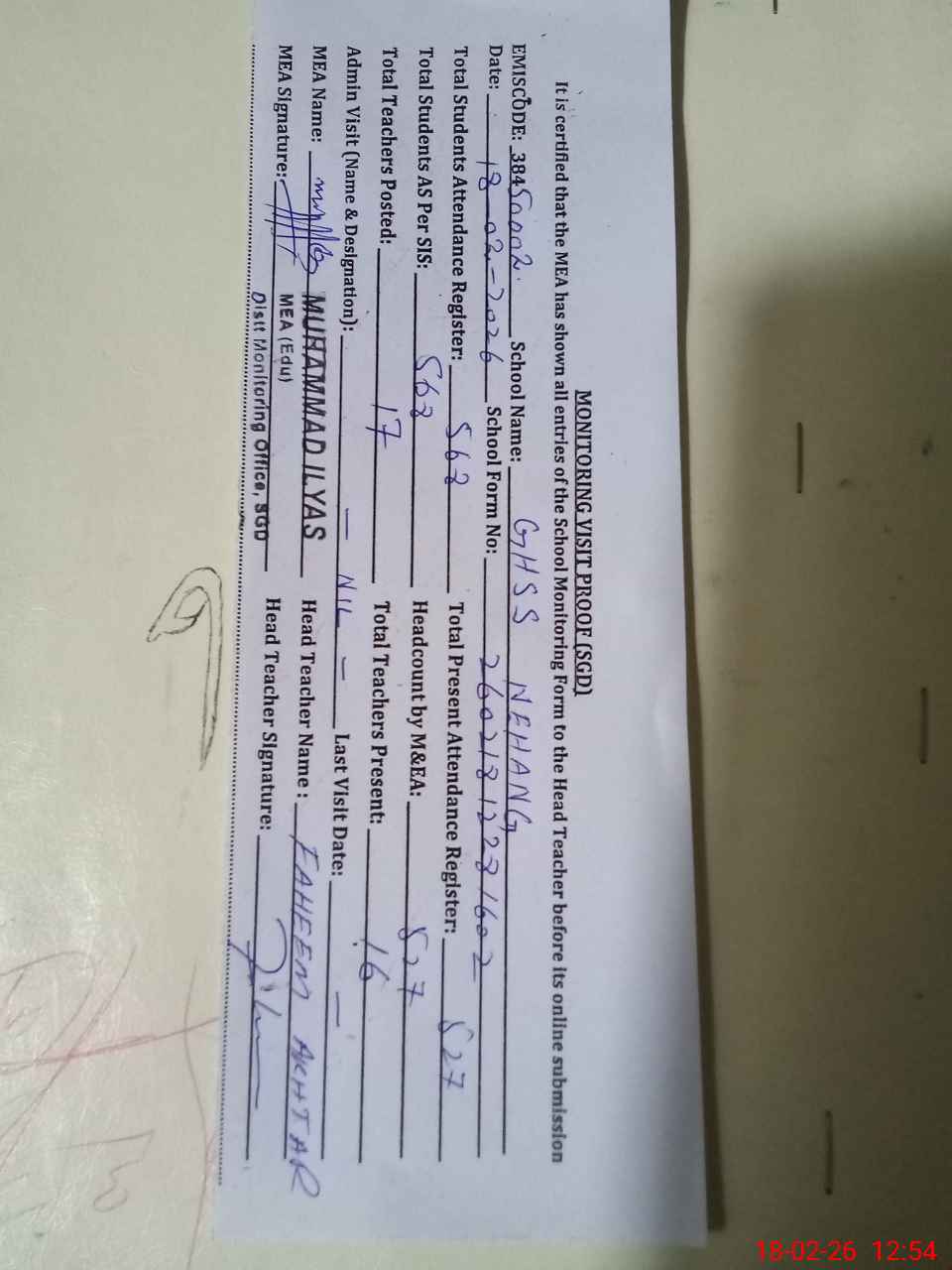 | Attendance Register | Head Teacher | MEA with School | Visit Proof |