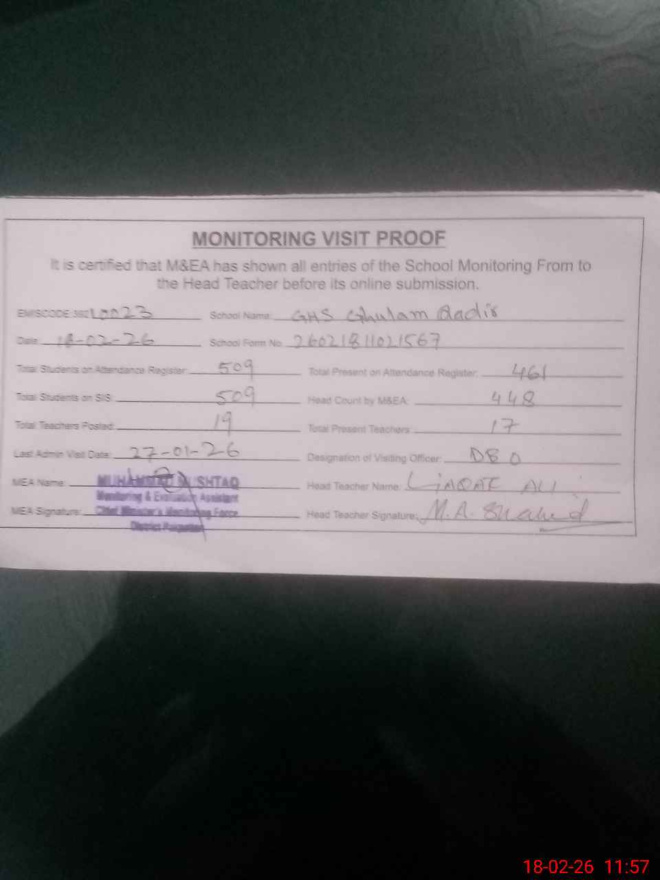 | Attendance Register | Head Teacher | MEA with School | Visit Proof |
