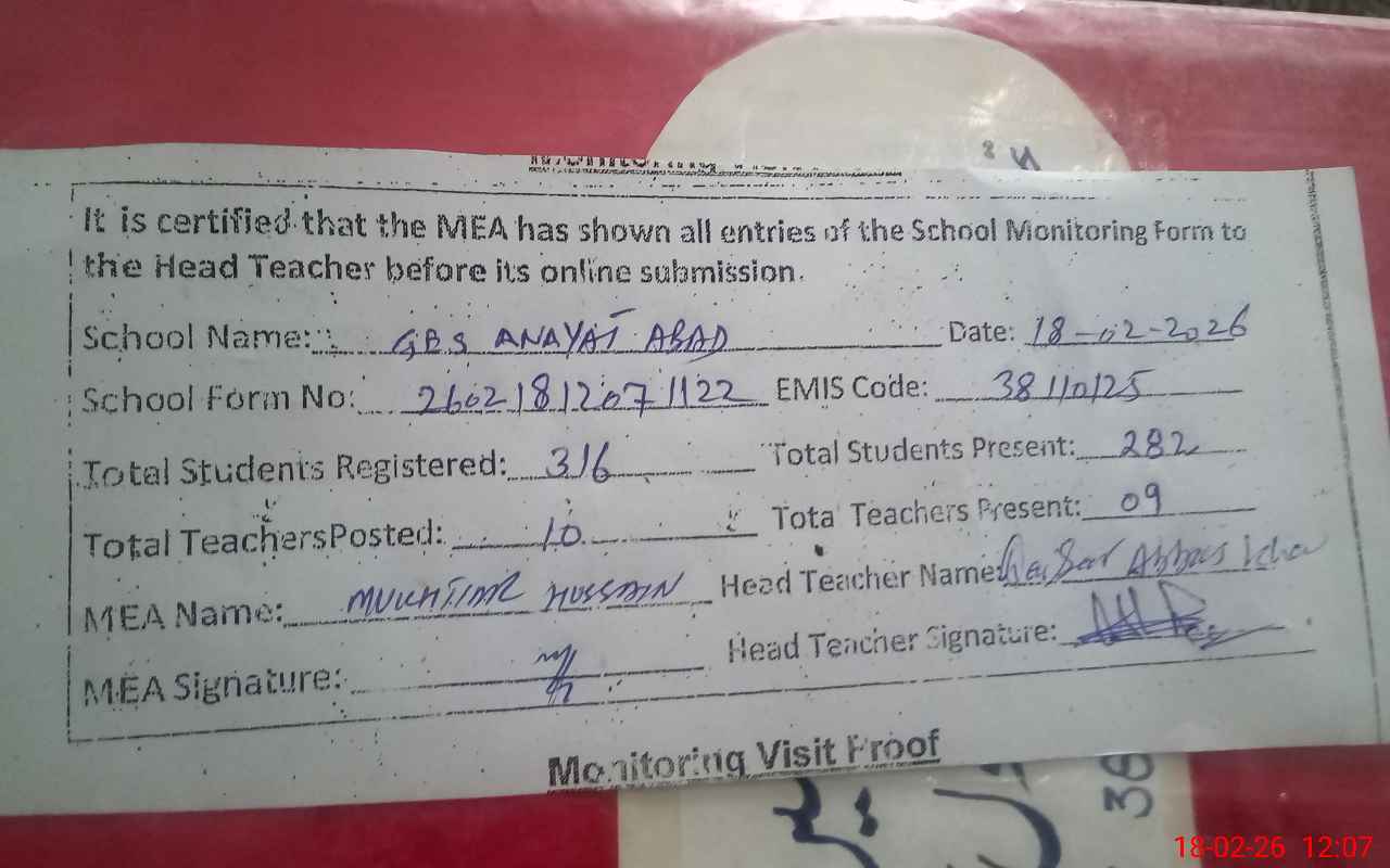 | EMIS Code: 38110125 | Name of School: GES ANAYAT ABAD | |||