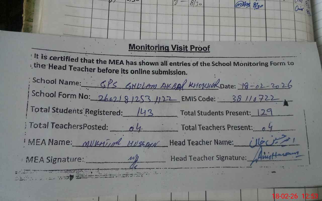 | EMIS Code: 38110722 | Name of School: GPS GHULAM AKBER KHOKHAR | |||