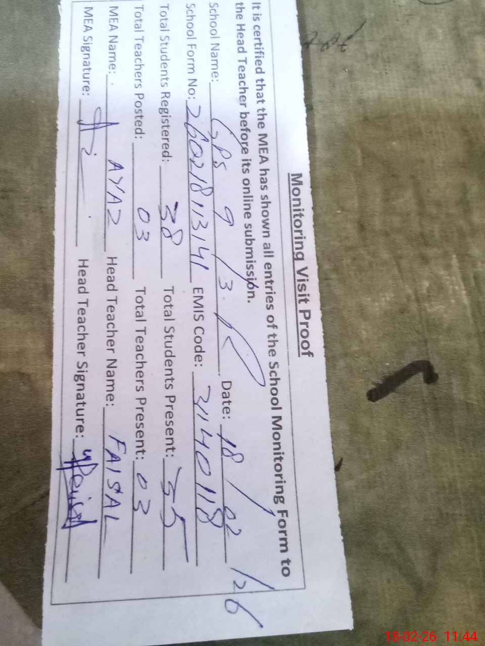| Attendance Register | Head Teacher | MEA with School | Visit Proof |
