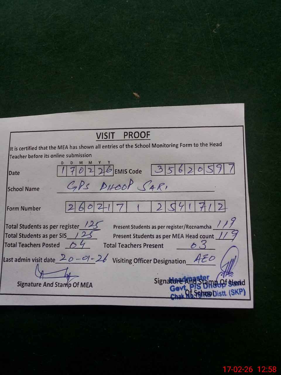 | EMIS Code: 35620597 | Name of School: GPS DHOOP SARI CHAK NO.78 | |||
