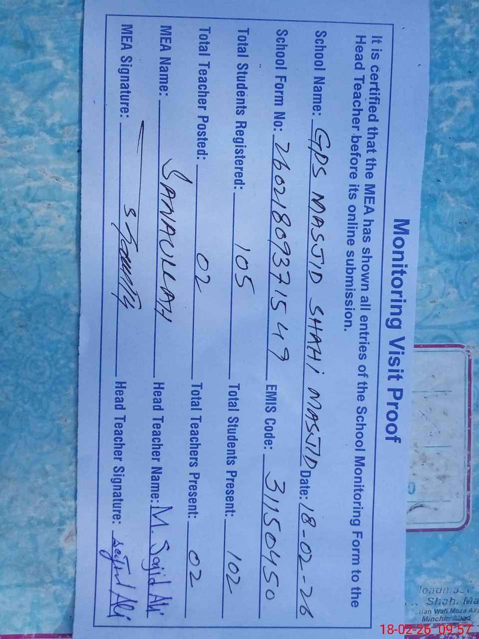 | Attendance Register | Head Teacher | MEA with School | Visit Proof |